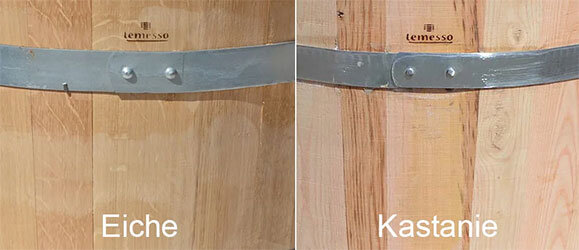 Kastanienholz zeichnet sich durch einen höheren Gehalt an Gerbsäure im Vergleich zu Eichenholz aus, wodurch es für die Weinlagerung ungeeignet wird. Dank seines schnelleren Wachstums ist Kastanienholz leichter und kostengünstiger, wodurch die daraus gefertigten Fässer besonders einfach zu handhaben sind. Diese Eigenschaften machen sie zur idealen Wahl für Dekofässer oder Pflanzkübel.