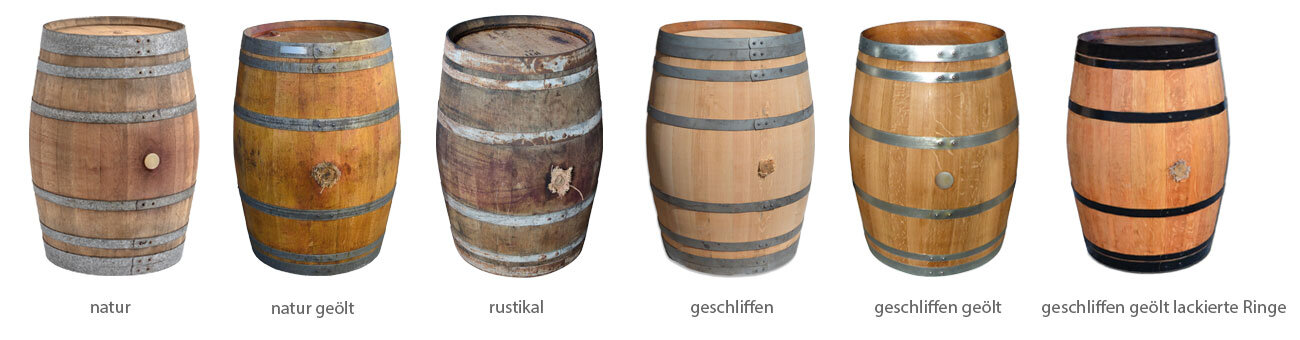 Äußerlich wirken Weinfässer oft glatter und gepflegter, da sie traditionell zur Reifung edler Weine verwendet werden. Aus geschmacklichen Gründen werden sie bereits nach wenigen Jahren aussortiert, wodurch sie noch viele Jahre als dekorative und praktische Elemente im Garten genutzt werden können.